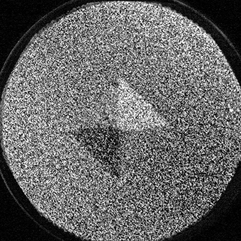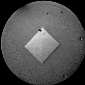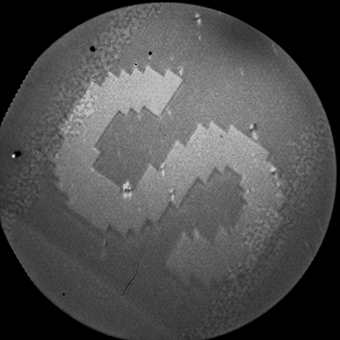 Above images of magnetic domains were obtained at the L3 Fe edge (706.8eV). On the left: XAS image acquired with linear polarization of synchrotron radiation. On the right: XMCD differential image of closed magnetic loop of Landau type domains. The field of view is 50μm.