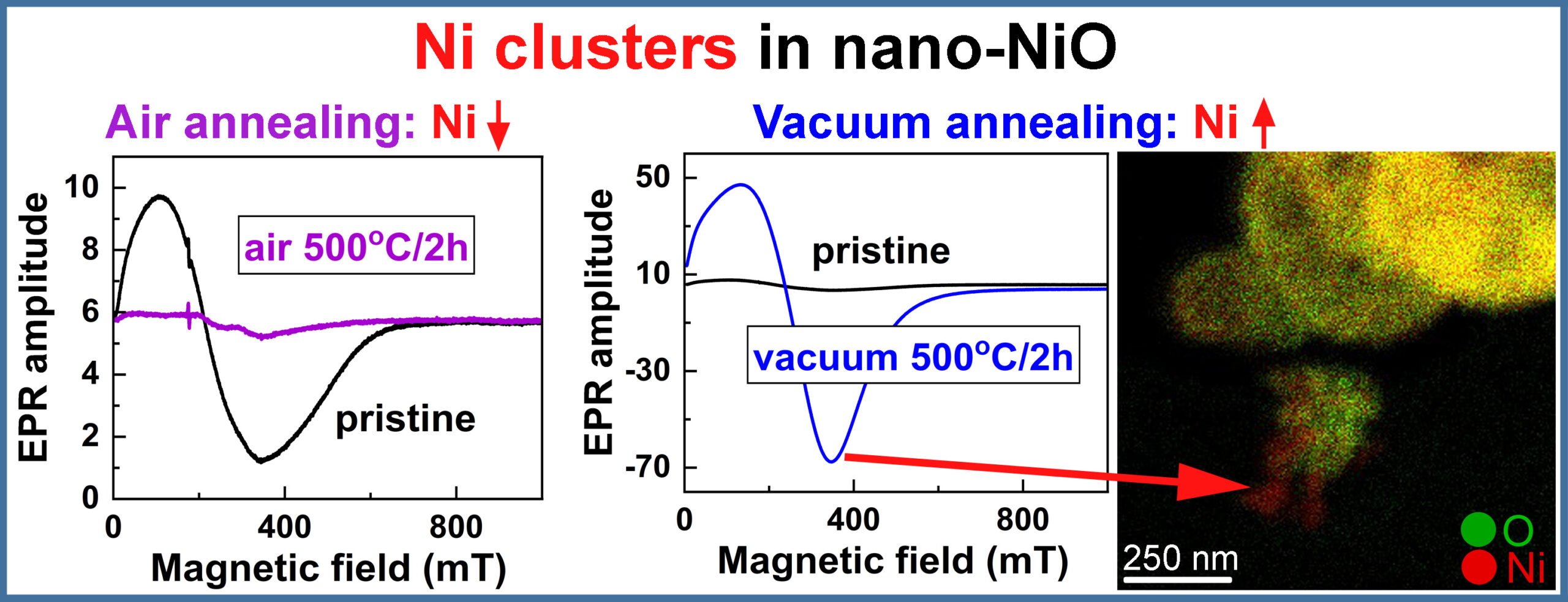 The NiO nanoparticles calcined at 400°C and 500°C exhibited marked differences in their morphology, defect structure, and gas-sensing performance. The annealing processes in vacuum and air induced further changes in these properties. The Electron Paramagnetic Resonance and Transmission Electron Microscopy studies revealed the presence of a minority phase of metallic nickel clusters in the superficial layer of the NiO nanoparticles annealed in vacuum, while air annealing resulted in the oxidation of these clusters, which significantly affected the sensor response to CO at 250°C operating temperature. The dissolution of nickel clusters induced a decrease in the concentration of free charge carriers, which are critical to the material’s conductivity, and consequently led to an increase in the baseline resistance.