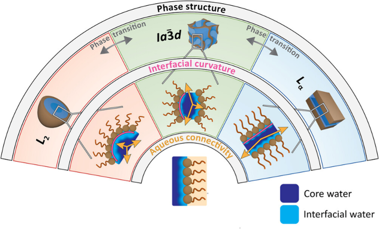 To investigate this, Sara Catalini (University of Florence), Yang Yao (University of Basel) and colleagues exploited model systems made from special lipids inspired by archaea, microorganisms that thrive in extreme environments like hot springs. These lipids can self-assemble with water into well-defined structures, known as lipidic mesophases. By adjusting temperature and hydration, scientists could switch between three distinct arrangements: flat layered membranes (lamellar phase), a complex sponge-like structure with continuous water channels (a cubic “gyroid” phase), and tiny isolated water droplets surrounded by lipids (reverse micelles). Although all these phases contain water, their geometry is radically different, and so is the water’s behavior.